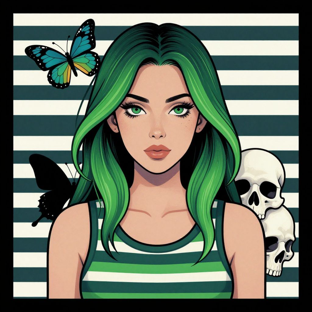 A stylized portrait of a woman with green hair, wearing a striped top, surrounded by a butterfly and a skull, set against a striped background.