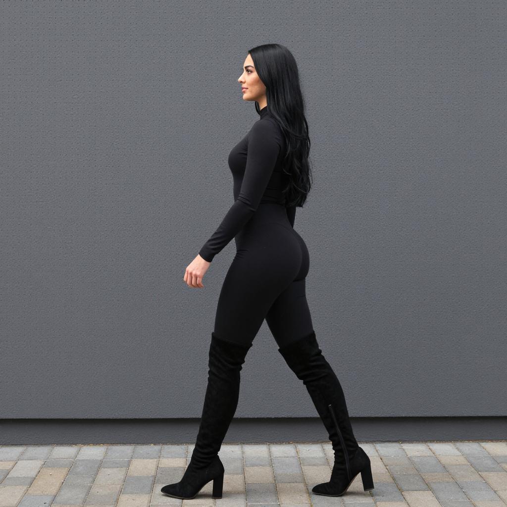 Side profile of a woman with long black hair wearing a tight black jumpsuit paired with black suede thigh-high heeled boots. She is walking against a perforated gray wall with a gray brick paved ground, looking slightly over her shoulder.