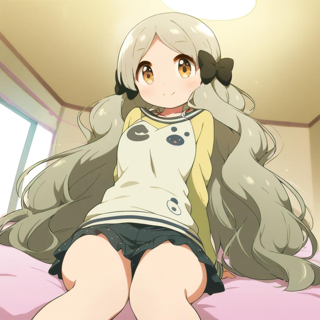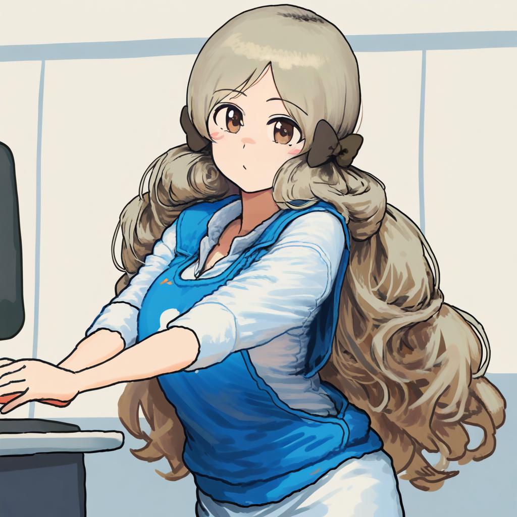 Handa roco, idolmaster, 1girl, yellow eyes, long hair, very long hair, grey hair, light brown hair, parted bangs, twintails, hair bow, by artist hekiga (freelot), leet