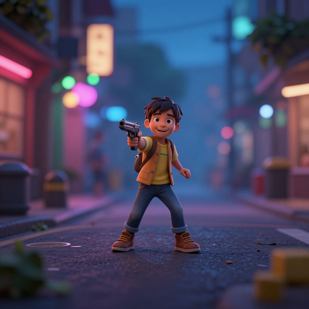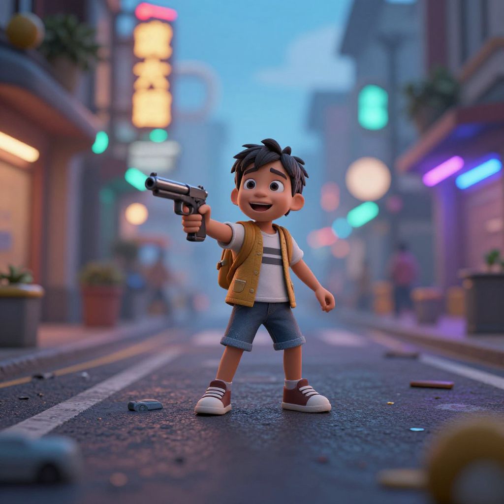 Digital 3D cartoon of a young boy in a brown vest, white shirt, and denim shorts, holding a gun on a neon-lit,