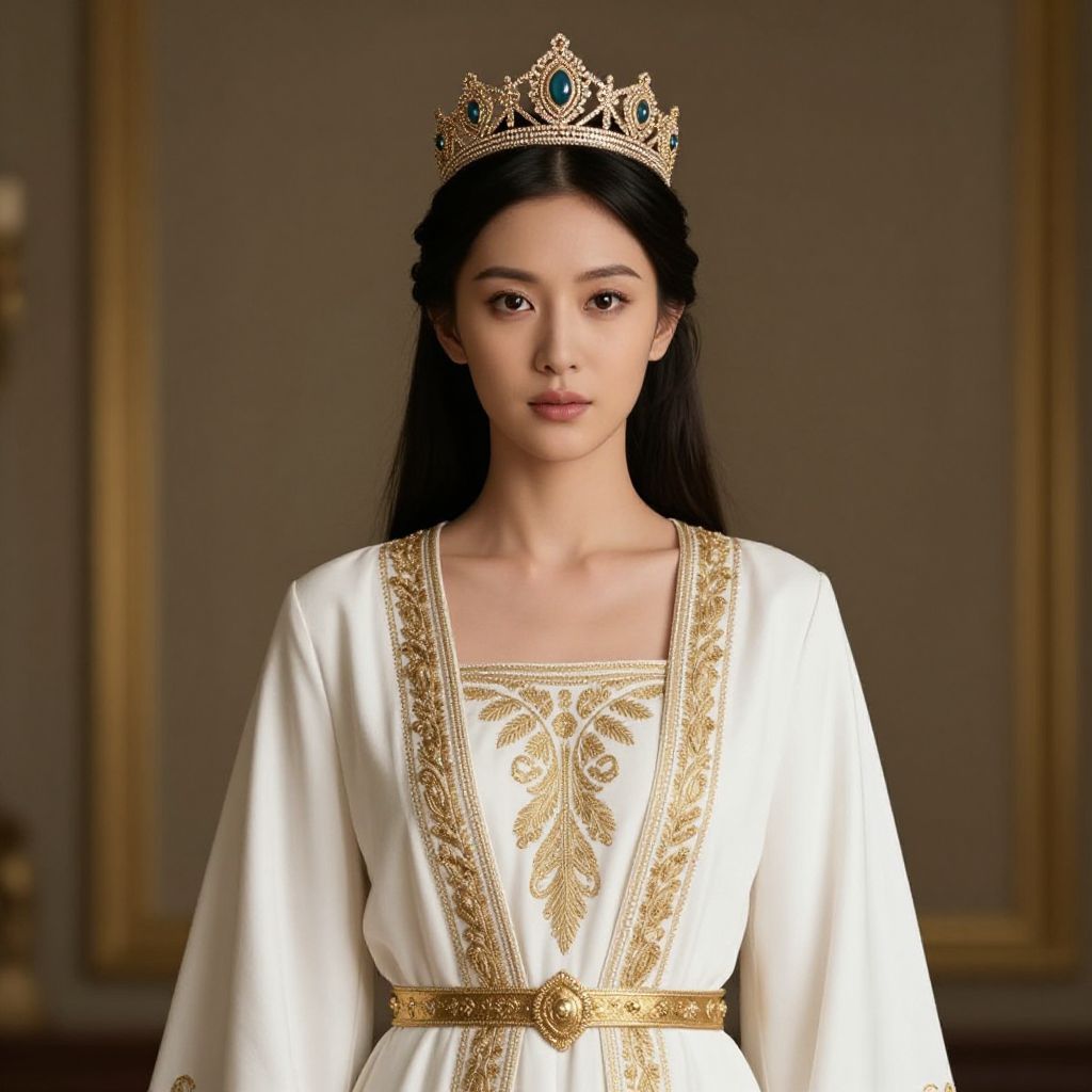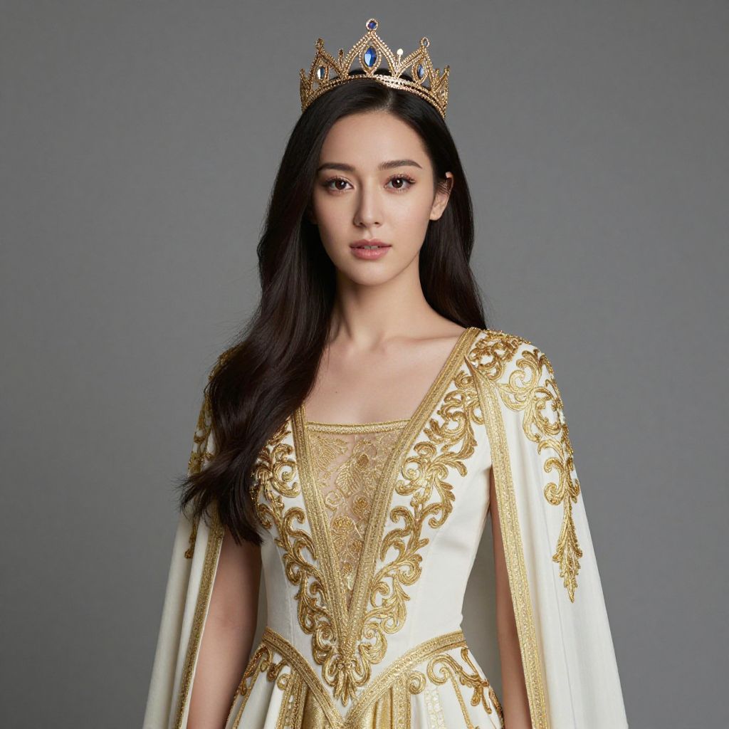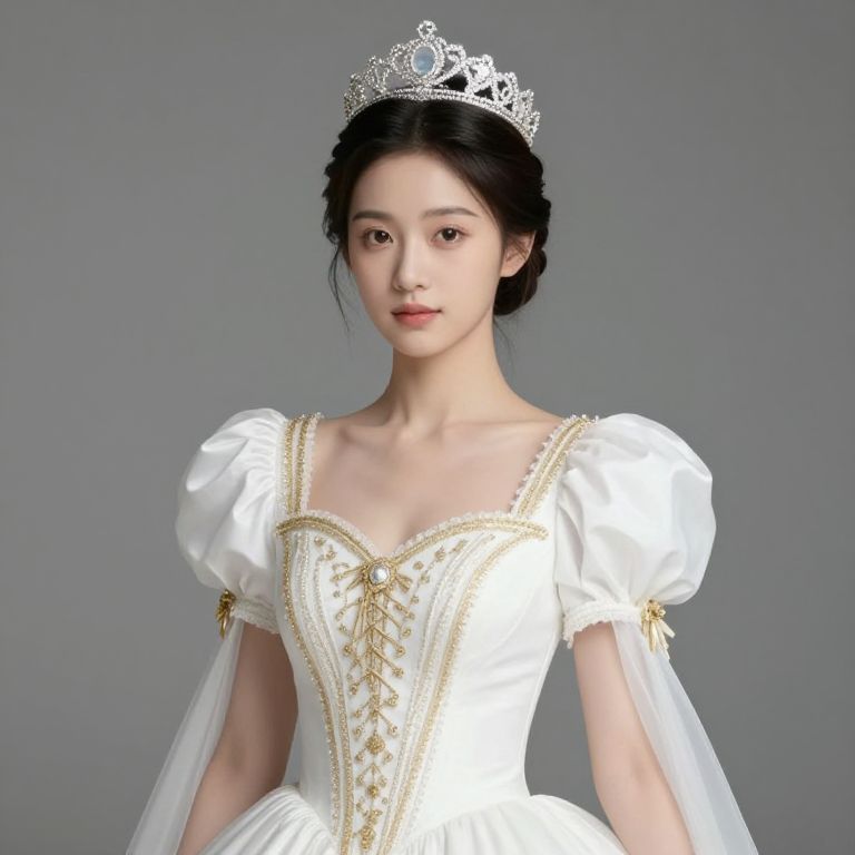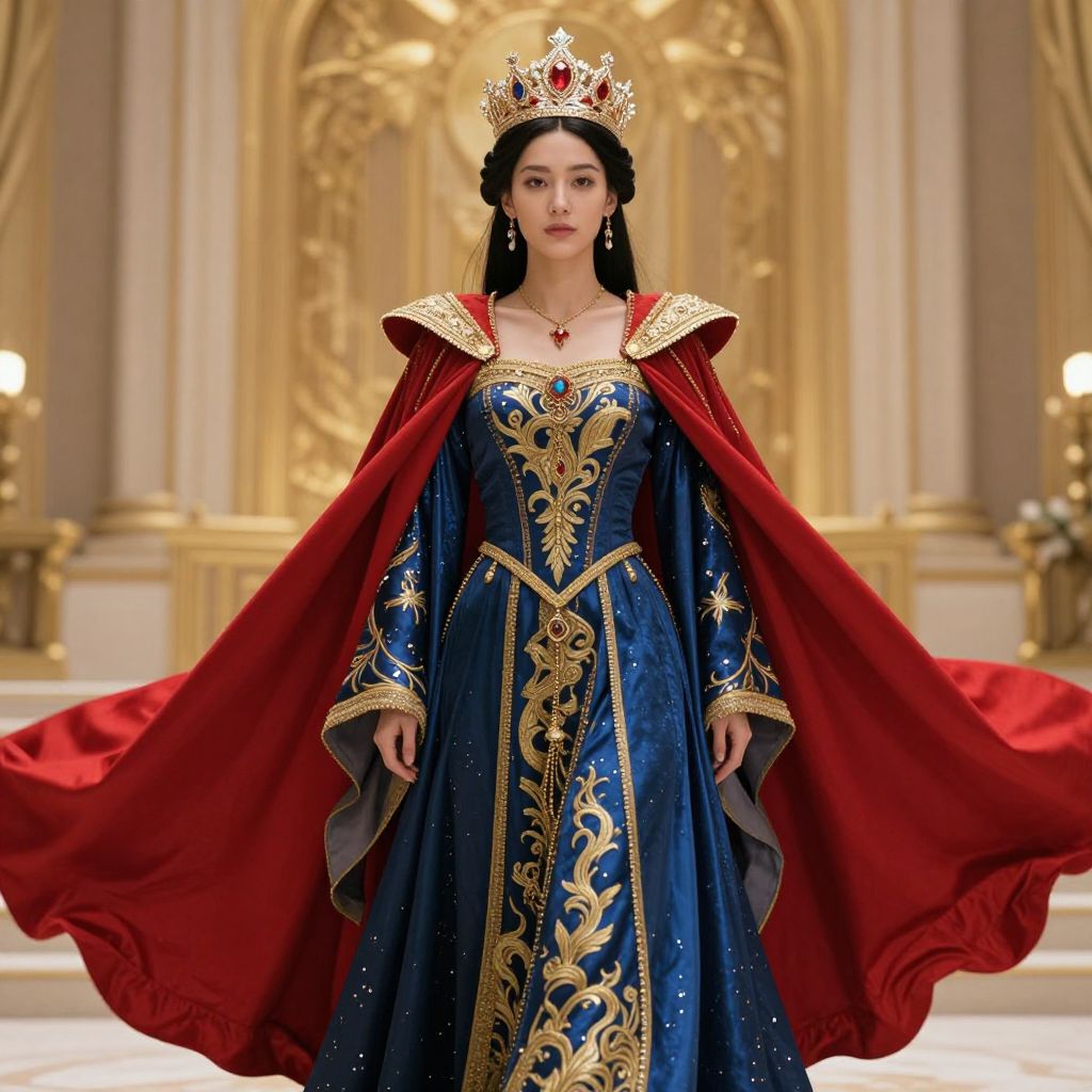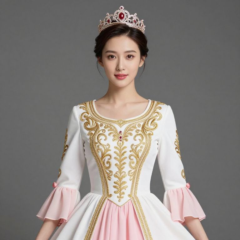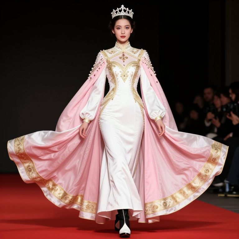 Female, ornate, white, pink, and gold dress with a crown on her head. The dress has a high neckline, long sleeves, and a flowing skirt with a pink and gold pattern. The skirt is draped over her shoulders, and she is wearing a pair of black and white boots. The background is dark, and there is a red carpet.
