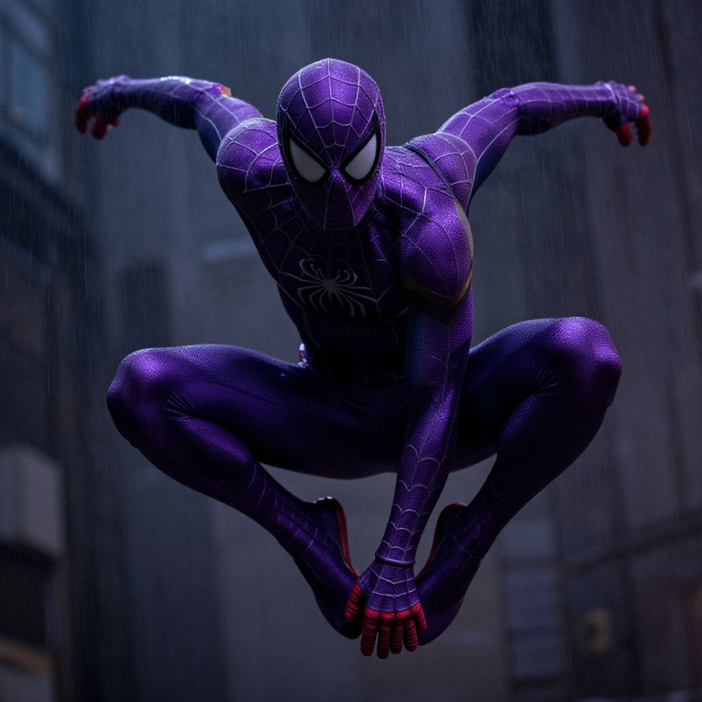 Purple Spider Man suit swinging through a dark urban environment, the suit textured with metallic purple armor plates and subtle web motifs, intense action scene with rain and mist, cinematic lighting with a moody atmosphere.