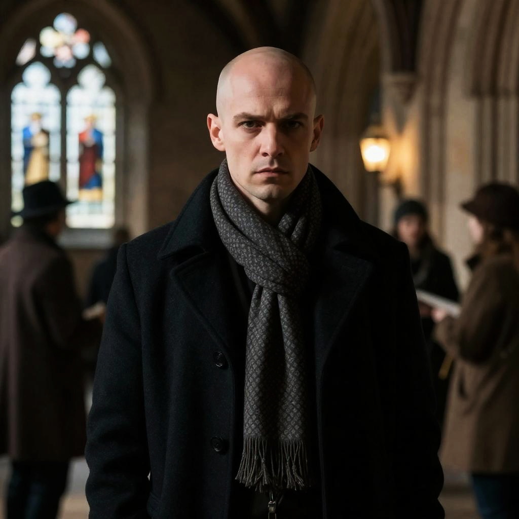 Bald man with stern expression, wearing dark coat and patterned scarf, stands in dimly lit Gothic-style hall. Blurred people in background. Warm light from windows. Several people, some with hats, partially visible. Stone arches and stained glass.