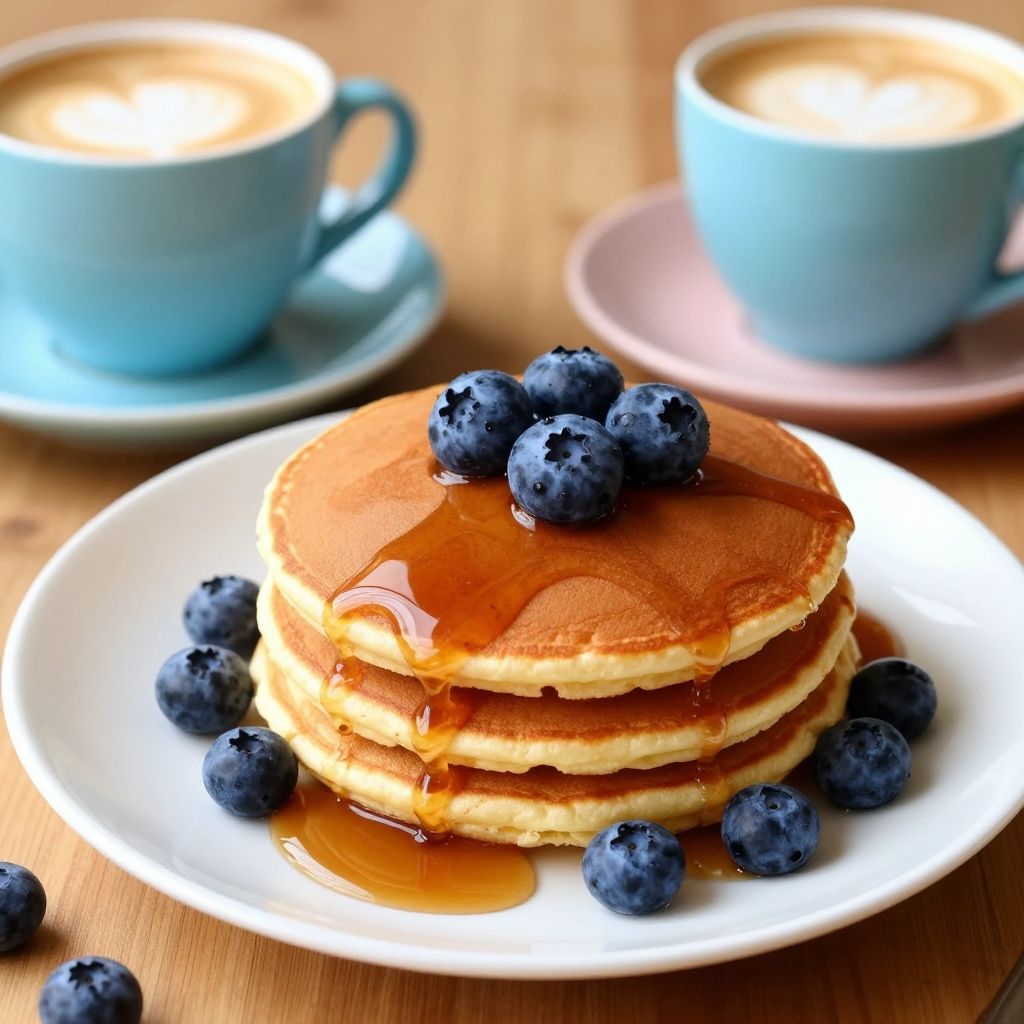 Terupancake being served on a white plate with fresh herbs, ripe mango, and a sprinkle of chili flakes, set against a tropical countryside backdrop with green trees in the background.