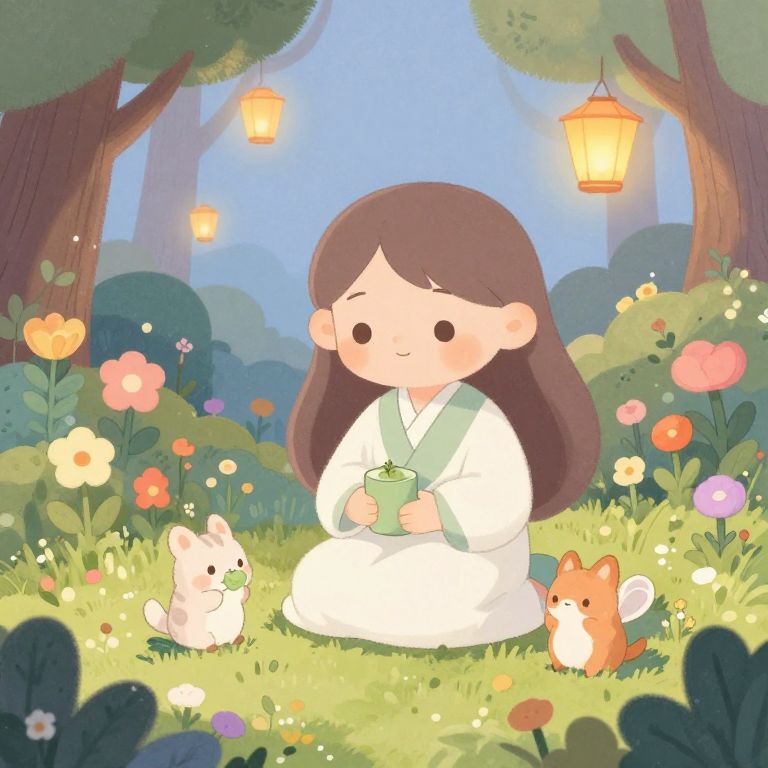 A whimsical scene of Margrot as a gentle healer, surrounded by blooming flowers and small forest animals, soft pastel colors, dreamlike environment with floating lanterns, detailed illustrations, fantasy storybook style.