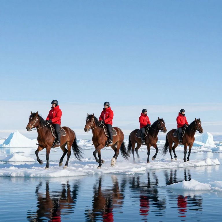 Four riders in vibrant red jackets traverse a serene arctic landscape atop three horses, gracefully navigating across floating icebergs that reflect the tranquil blue waters below under a clear, expansive sky.