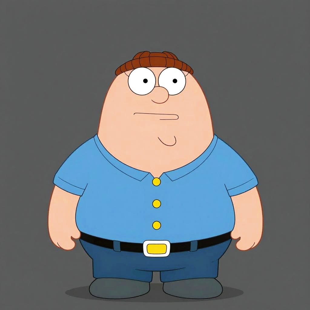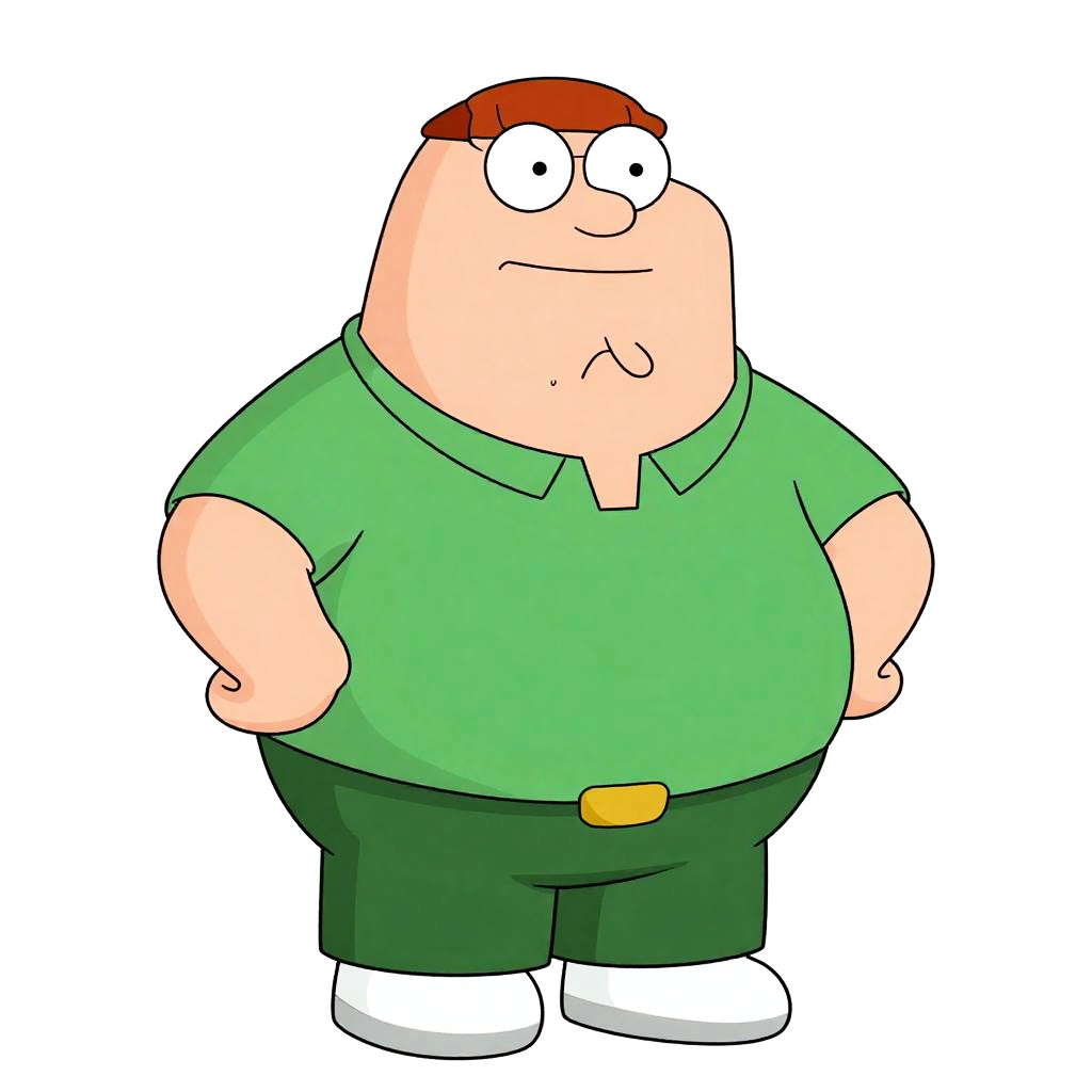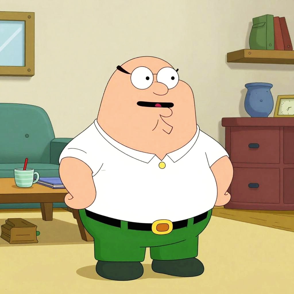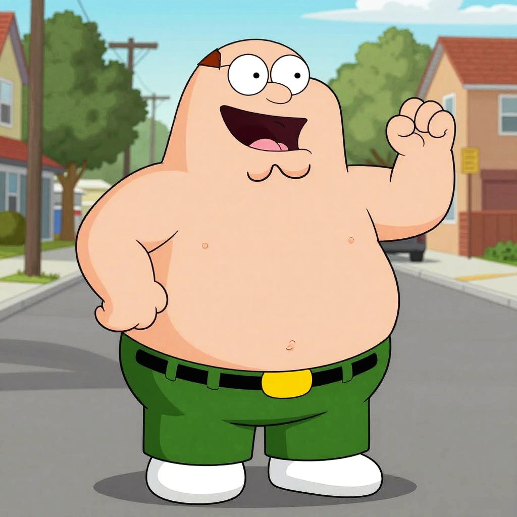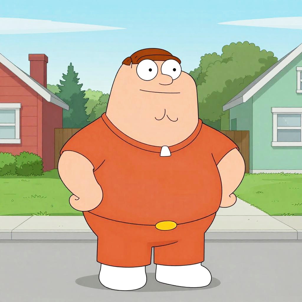 Peter Griffin full body, vibrant cartoon style, standing confidently in his iconic white shirt and green pants, surrounded by a simple suburban background, bright colors, exaggerated expressions, detailed character design, smooth lines, dynamic pose, animated sitcom vibe