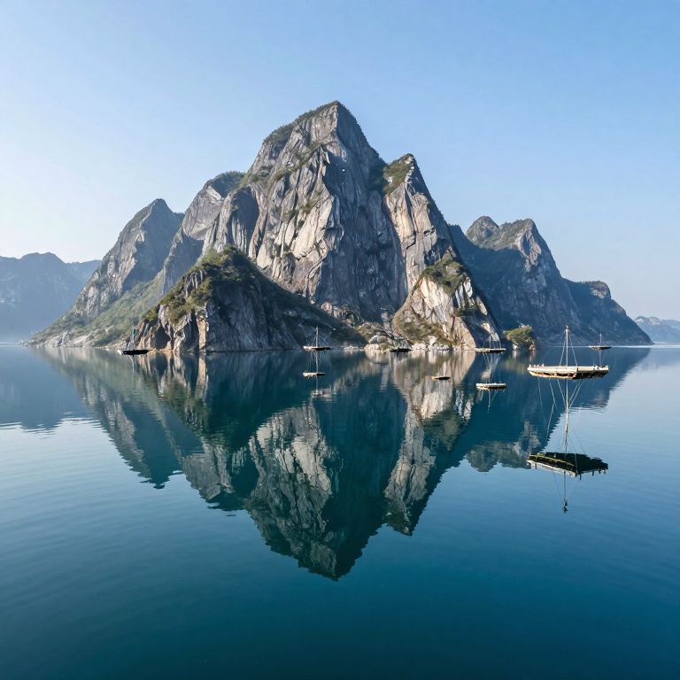Crystal-clear waters reveal a surreal seascape where jagged mountain peaks rise above the horizon, mirrored perfectly below by their inverted forms, while numerous floating platforms suspended by thin lines dangle beneath the surface, creating an otherworldly blend of land and sea.