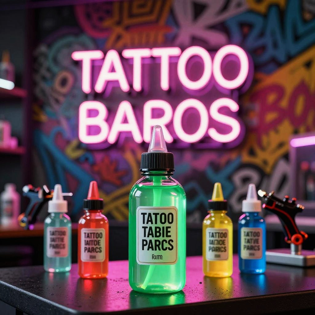 Tattoo prompt generator as a vibrant neon sign in a tattoo parlor, glowing ink bottles and tattoo machines arranged around, urban street art vibe, detailed and colorful, neon pink and green hues, energetic and dynamic composition