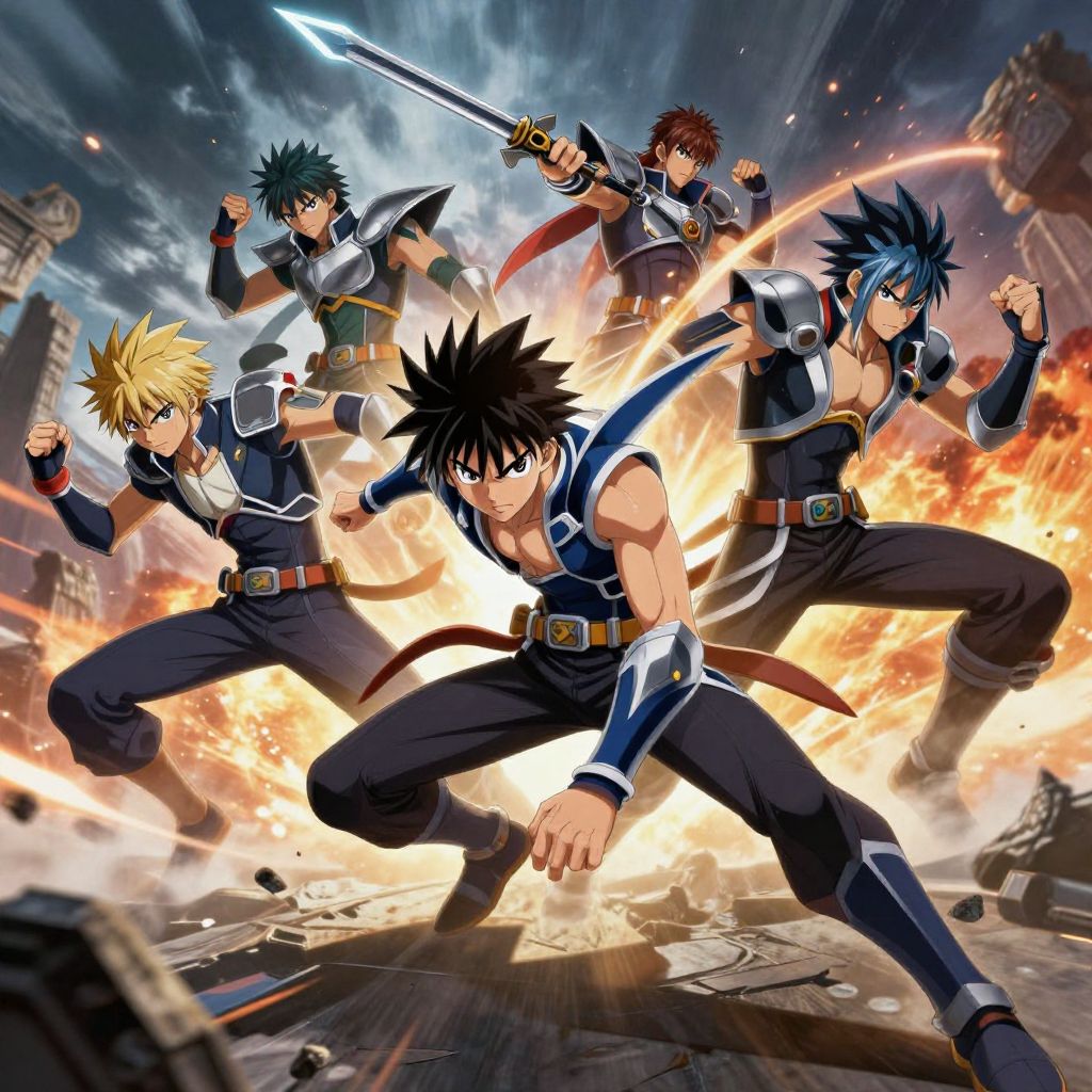 Dynamic anime illustration of six spiky-haired warriors in action poses, wielding swords, amidst fiery explosions and a cityscape background. Vibrant colors and intense