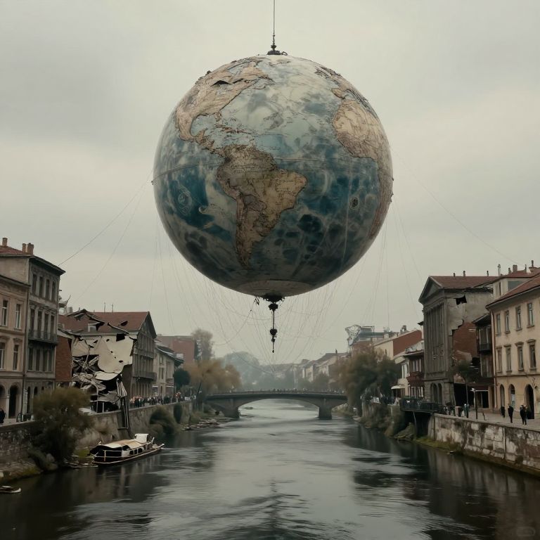 Suspended between decay and dreams, a colossal sphere of forgotten ambition hovers over crumbling streets, its tethered threads whispering echoes of lost languages and unspoken promises, while the silent river below mirrors the weight of history and the quiet resilience of what remains.
