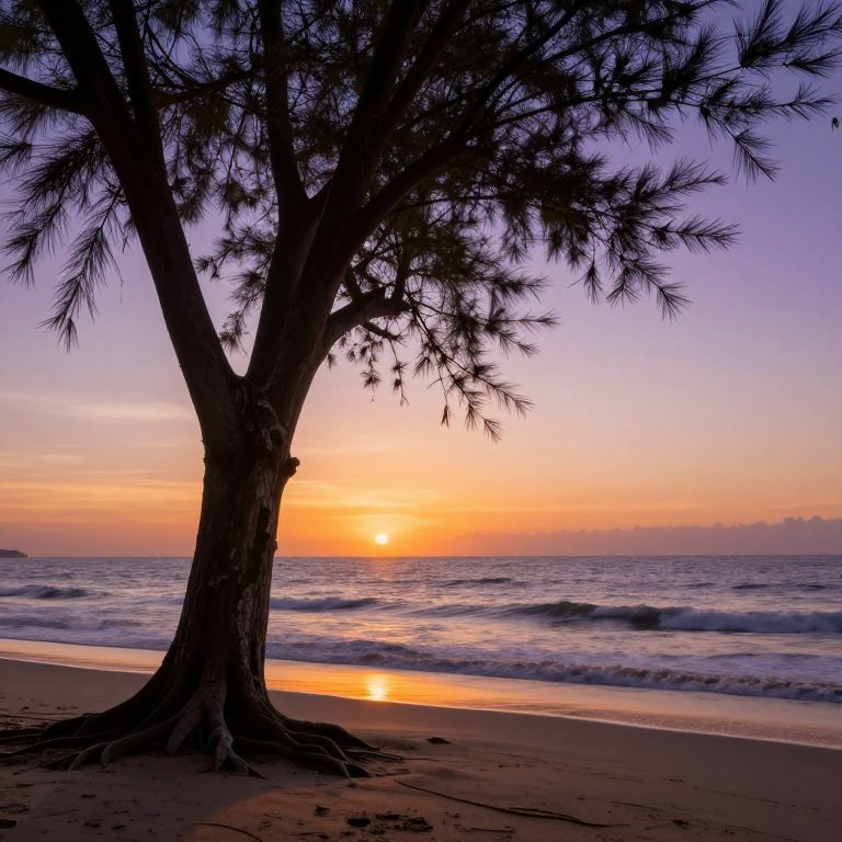 Envision an impressionistic coastal vista where a stately tree stands solitary on a peaceful shore, its limbs extending towards the sky as if yearning for celestial bodies far away. From a close-up perspective, we observe the intricate texture of the tree's bark and slender leaves contrasting against the serene ocean waves that softly caress its roots. The scene is bathed in the warm glow of a golden sunset, casting elongated shadows across the beach and creating a soft gradient from bright oranges to deep purples along the horizon. This serene yet thought-provoking image captures a sense of solitude and endurance, evoking both serenity and contemplation in the viewer, as if witnessing nature's own tranquil performance.