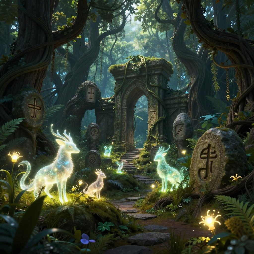 Mystical forest scene with glowing ethereal deer, ancient stone archway, runes, and luminescent flowers, enveloped in dense, enchanted