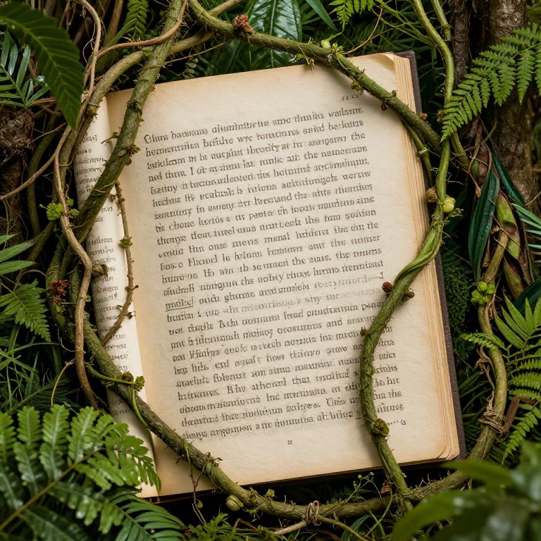 Photograph of an open book with yellowed pages, surrounded by green, fern-like leaves and intertwined, thorny vines. The text on the page is in a serif font, slightly blurred but readable. The vines form a loose, circular pattern around the book, which is centrally placed. The background is a dense, natural setting with varying shades of green, creating a lush, forest-like atmosphere. The image has a vibrant, realistic style, emphasizing the contrast between the organic elements and the aged, textured paper of the book.