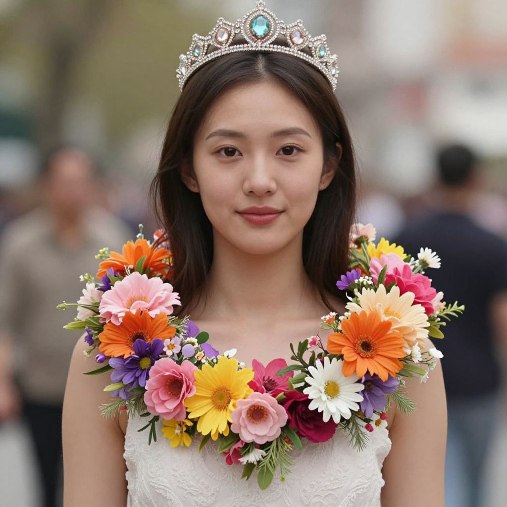 Female, male, female, female is wearing a floral wreath around her neck. The wreath is made up of a variety of colorful flowers, including pink, orange, yellow, and purple. The woman has a crown on her head, and the background is blurred.