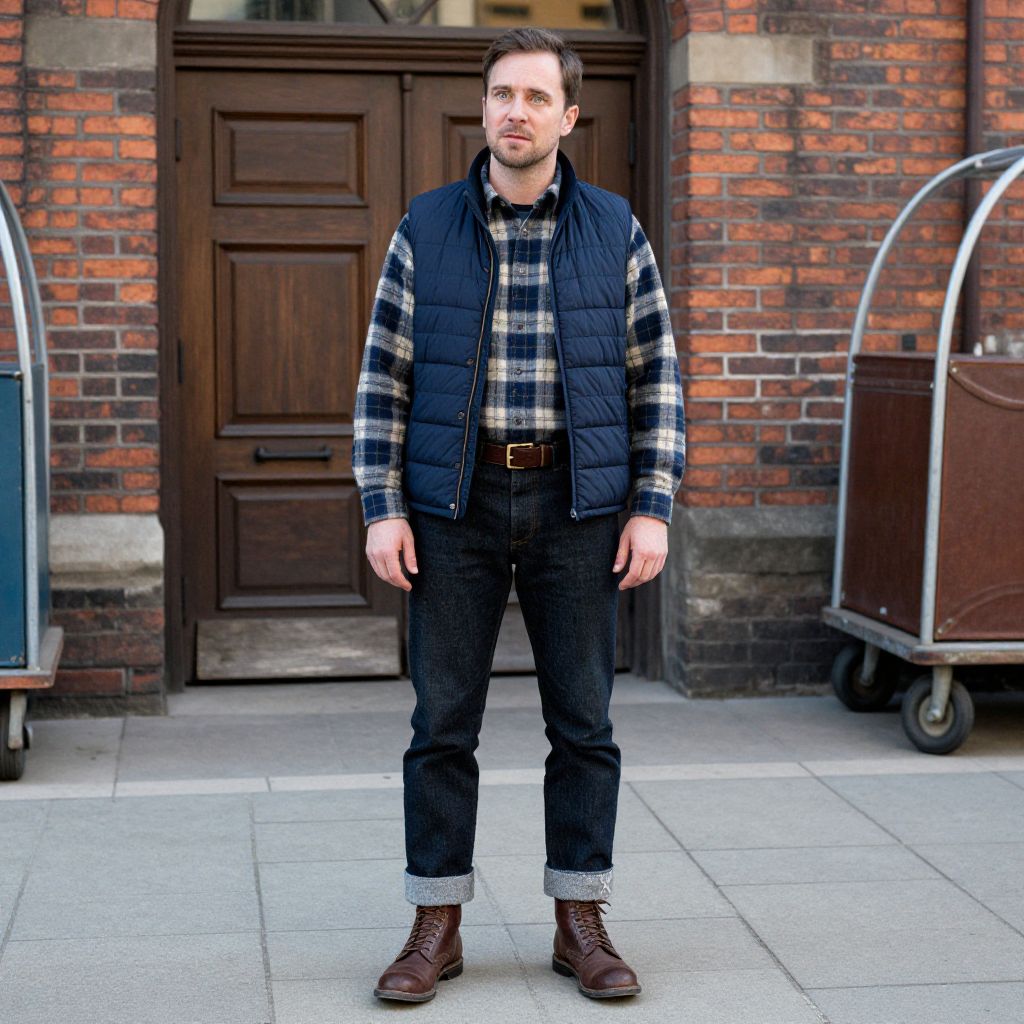 A man, navy striped polo shirt, olive green khaki shorts, brown leather loafers, smart-casual look, standing in front of a historic brick building, large wooden doors, vintage luggage carts outside, vintage photo style, relaxed smile, casual confidence. Man has masculine face and piercing eyes
