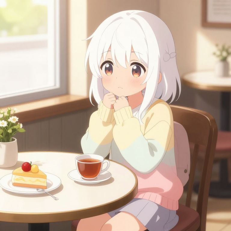 Cute anime girl white hair, sitting at a cozy cafe table filled with colorful desserts and tea, warm sunlight streaming through nearby window, wearing a cute pastel-colored sweater and skirt, big bright eyes, casual and heartwarming anime scene