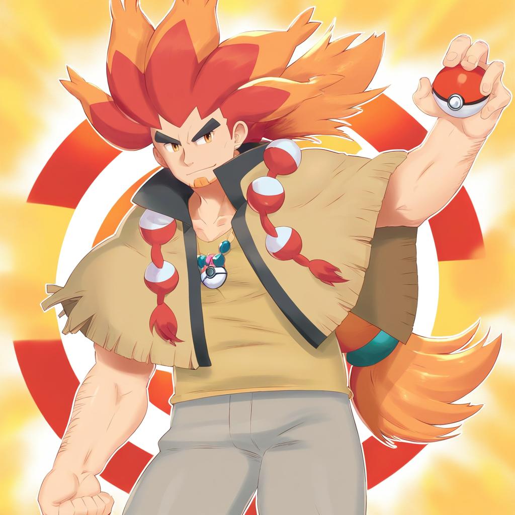 Alder (pokemon), pokemon, 1boy, orange hair, red hair, long hair, two-tone hair, facial hair, arm hair, spiked hair, leg hair, ponytail, hair tie, popped collar, necklace, poncho, poke ball (basic), poke ball, by artist shinozuka atsuto, leet