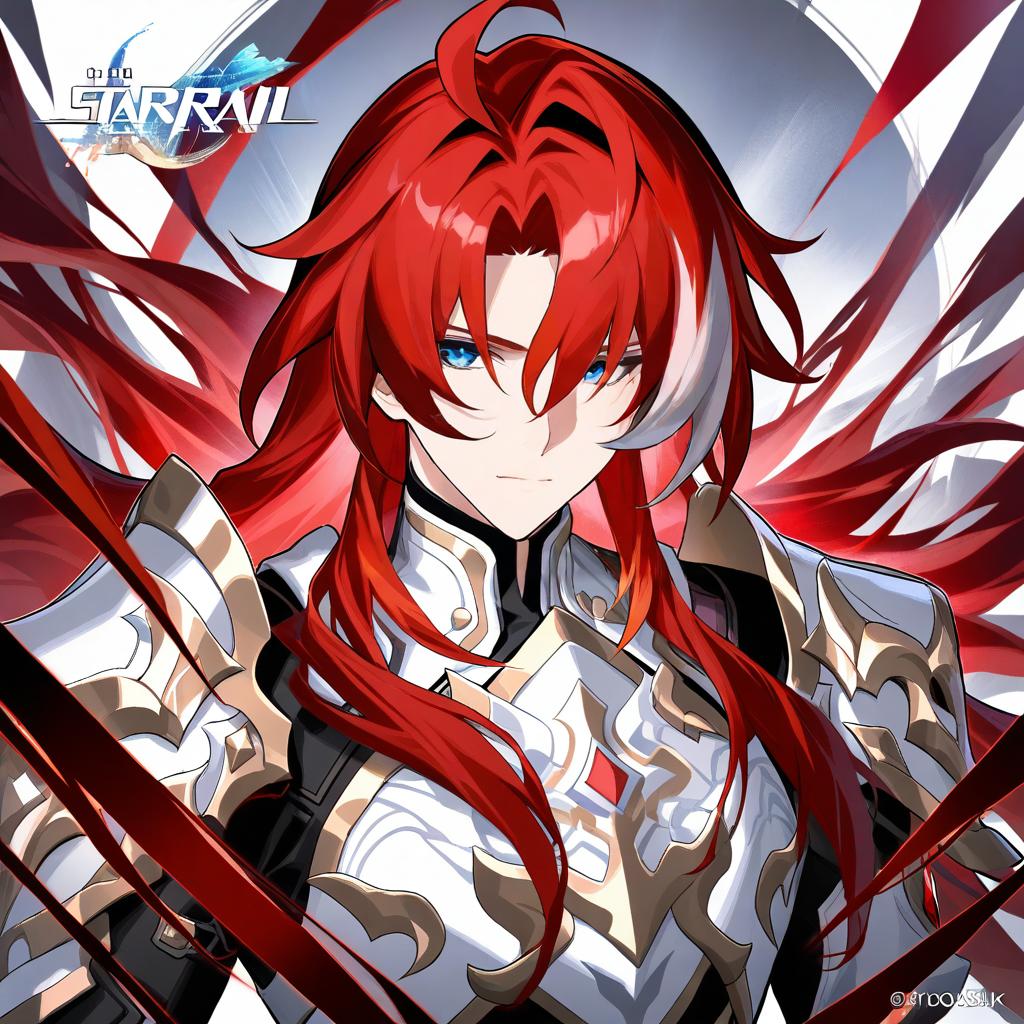 Argenti (honkai: star rail), honkai: star rail, 1boy, green eyes, hair between eyes, red hair, long hair, curtained hair, streaked hair, ahoge, parted bangs, white armor, knight, gauntlets, knight, pauldrons, breastplate, by artist kousaki rui, animagine