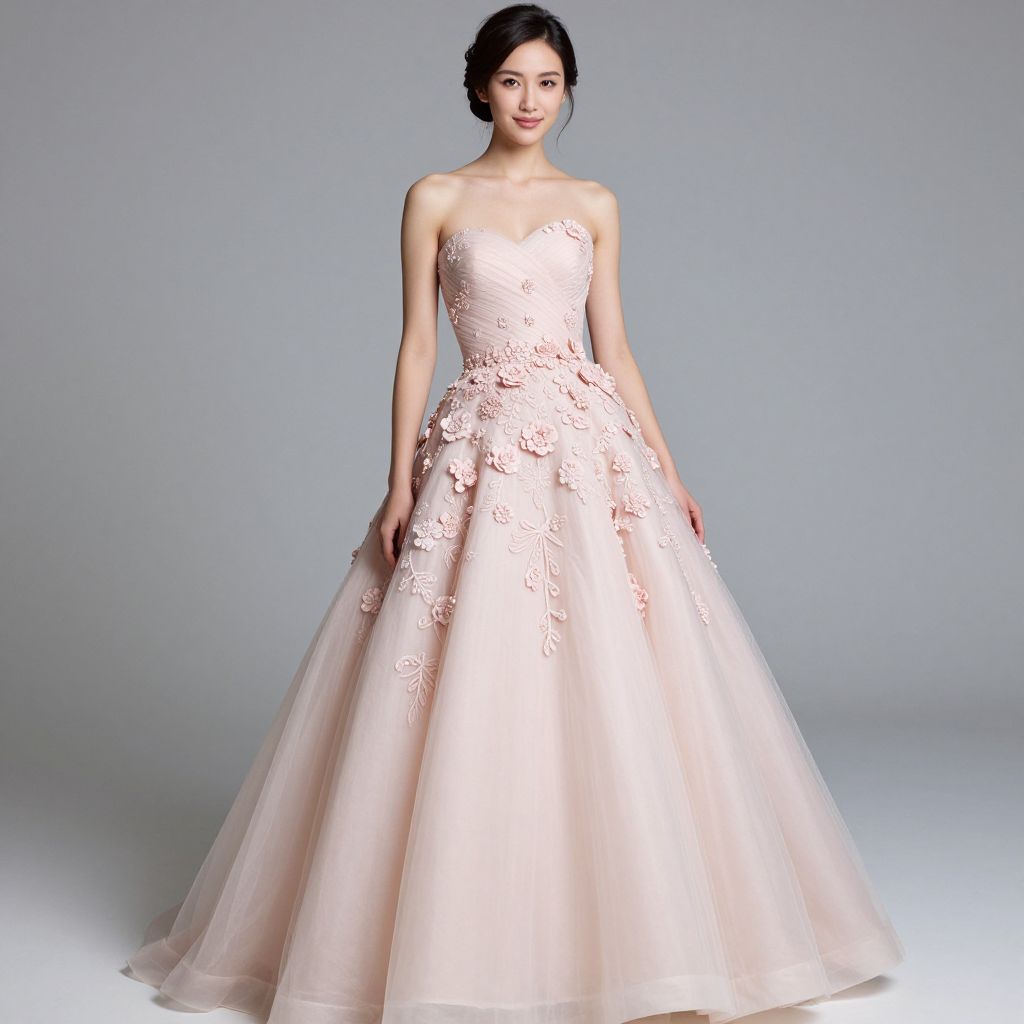 Photograph of a young Asian woman with fair skin and dark hair in an elegant updo, wearing a strapless, blush pink, full-length wedding gown with intricate floral lace embroidery on the bodice and skirt. The dress has a fitted waist that flares out into a voluminous tulle skirt. She stands against a plain, light gray background, looking directly at the camera with a subtle smile. The lighting is soft, highlighting the delicate texture and color of the dress. Her makeup is natural, emphasizing her features. The overall style is classic and sophisticated.