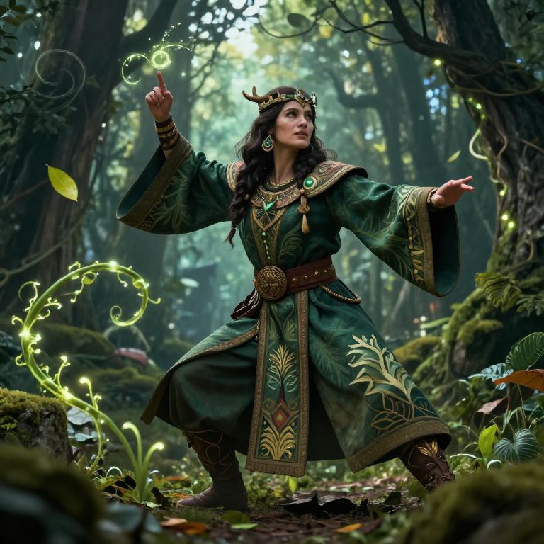 Halsin, druid in ceremonial robes with nature-themed patterns, commanding the elements in a lush forest clearing, dynamic pose with swirling leaves and glowing vines, high detail fantasy art, cinematic atmosphere