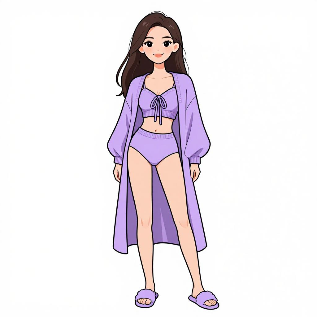 Woman with pretty face and pretty hair. smiling Woman, loungewear chic, coordinated set in soft lavender, cropped knit cardigan with front tie, matching high-waist briefs, floor-length duster with a relaxed fit, fluffy slide slippers, minimal jewelry, straight long hair, plain white background. --sref 1467