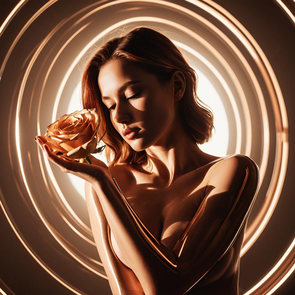 3D female transparent forearm, symmetrically centered, gleaming rose gold with warm amber highlights, captivating facial features, smooth contours, artistic play of light and shadow, striking reflections, modern design aesthetic, ethereal background enhancing spatial depth, ultra-detailed, high quality, visually stunning, scintillating ambiance.