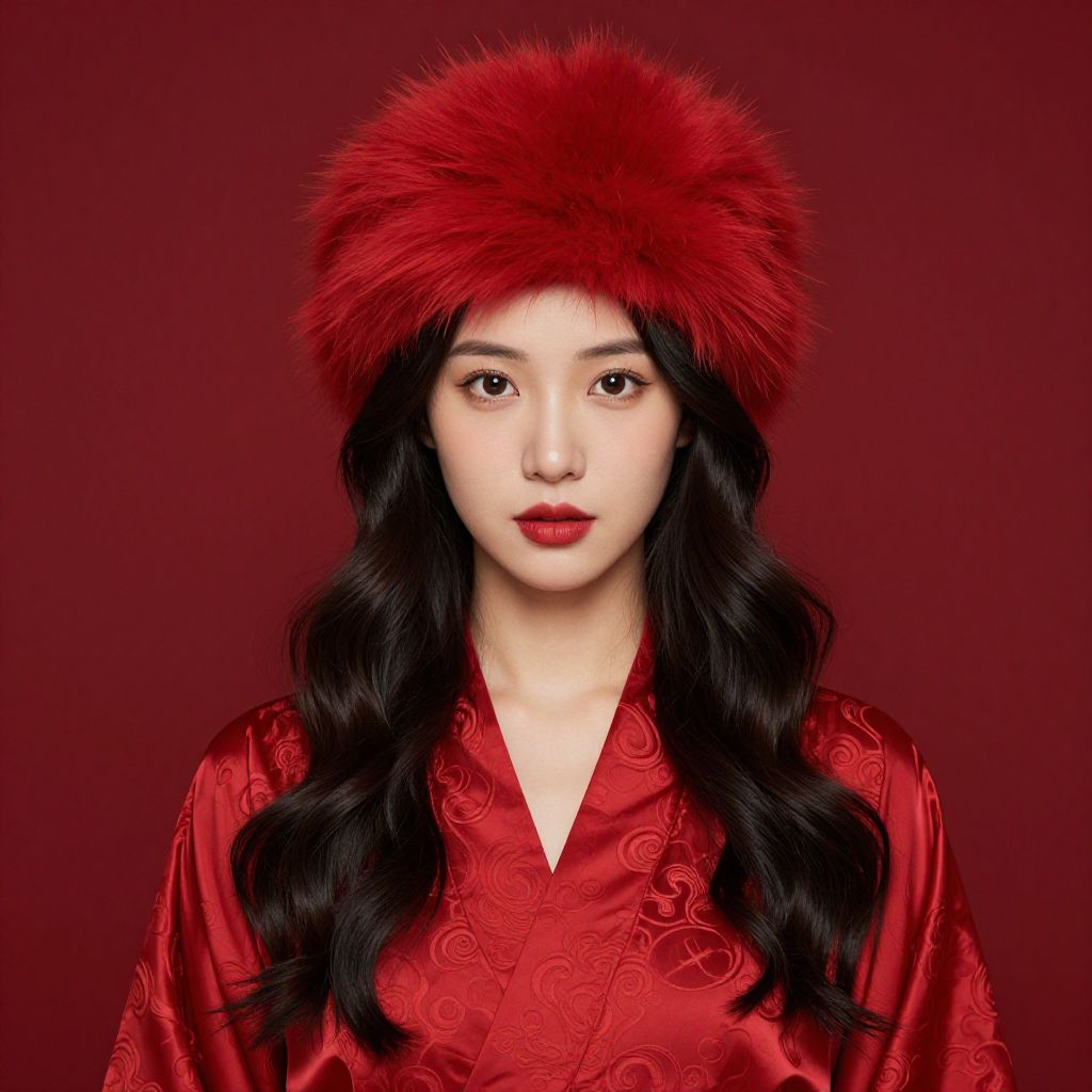 Photograph of a young Asian woman with long, wavy black hair, wearing a vibrant red, fluffy fur hat and a silky red robe with intricate swirl patterns. Her expression is neutral, with red lipstick matching her outfit. The background is a solid, deep red, enhancing the rich color of her attire. The lighting is even, highlighting her smooth, fair skin.