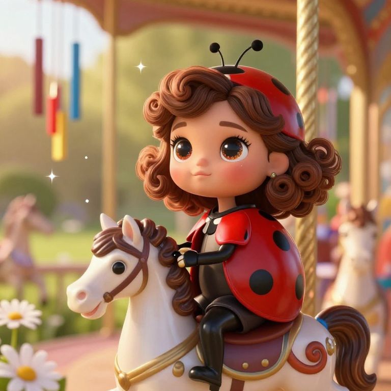 An adorable Ladybug girl with a radiant red and black design on her skin, her big sparkling eyes and curly brown hair, sitting on a vintage carousel horse in a fairy-tale park, surrounded by wind chimes, daisies, and tiny sparkles in the air, bathed in warm afternoon light with a touch of nostalgic charm.