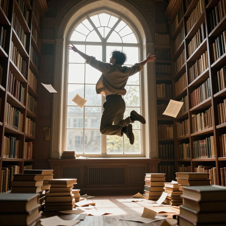 In a hallowed library where knowledge takes flight, a scholar leaps into the void, arms outstretched, chasing elusive truths as sunlight filters through ancient windows, casting a warm glow over scattered pages and stacks—a dance between the weight of wisdom and the freedom of discovery.