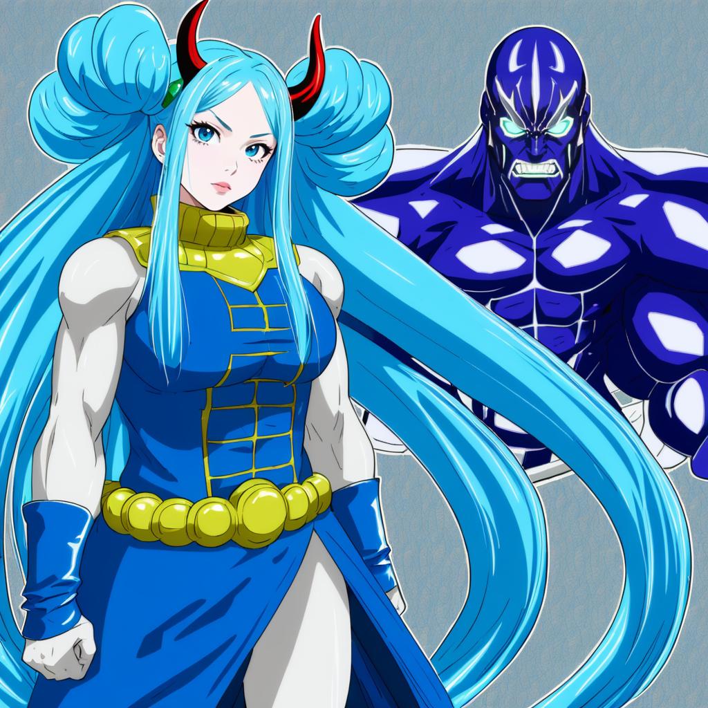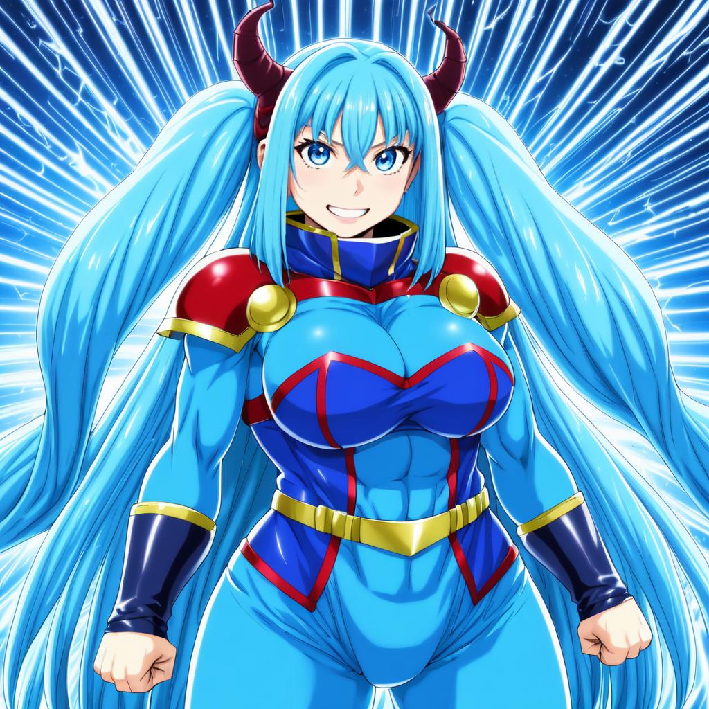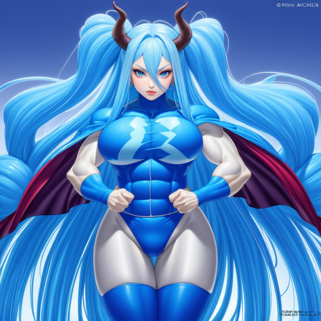 Digital anime-style artwork of a muscular female superhero character with very long blue twin drill hair, blue eyes, and curved horns. She wears a tight blue superhero costume with matching gloves and boots, a cape with a red inner lining, and has a confident stance with clenched fists. The background is a simple gradient blue sky.