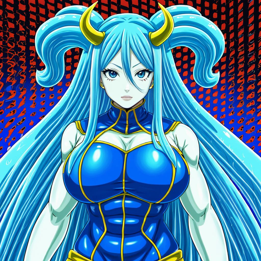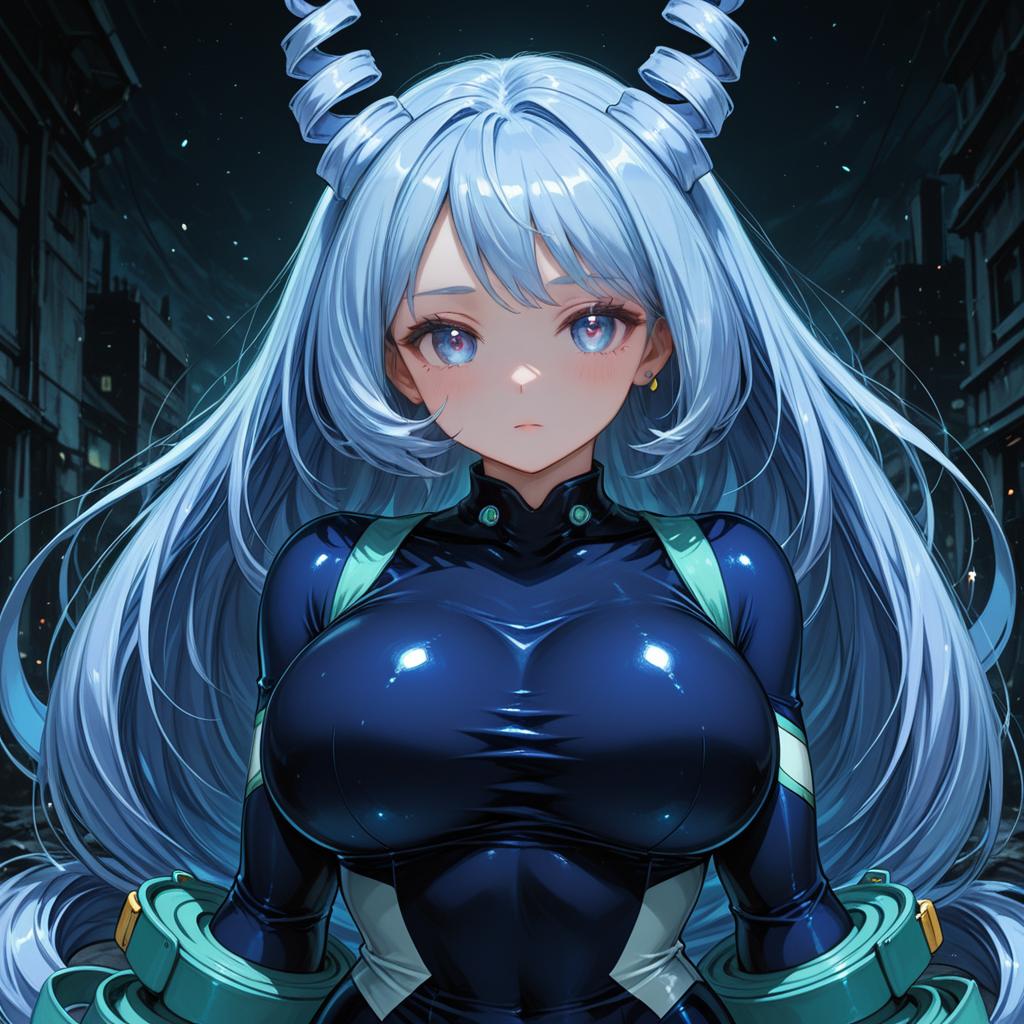 Hadou nejire, boku no hero academia, 1girl, hair horns, blue eyes, very long hair, blue hair, light blue hair, large breasts, superhero costume, twin drills, by artist nikichen, anime