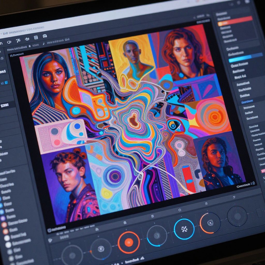 Close-up of an AI image mixer interface visualizing complex layers merging abstract patterns and human portraits, neon color palette, high-tech user interface elements, cyberpunk aesthetics, ultra-detailed digital painting.