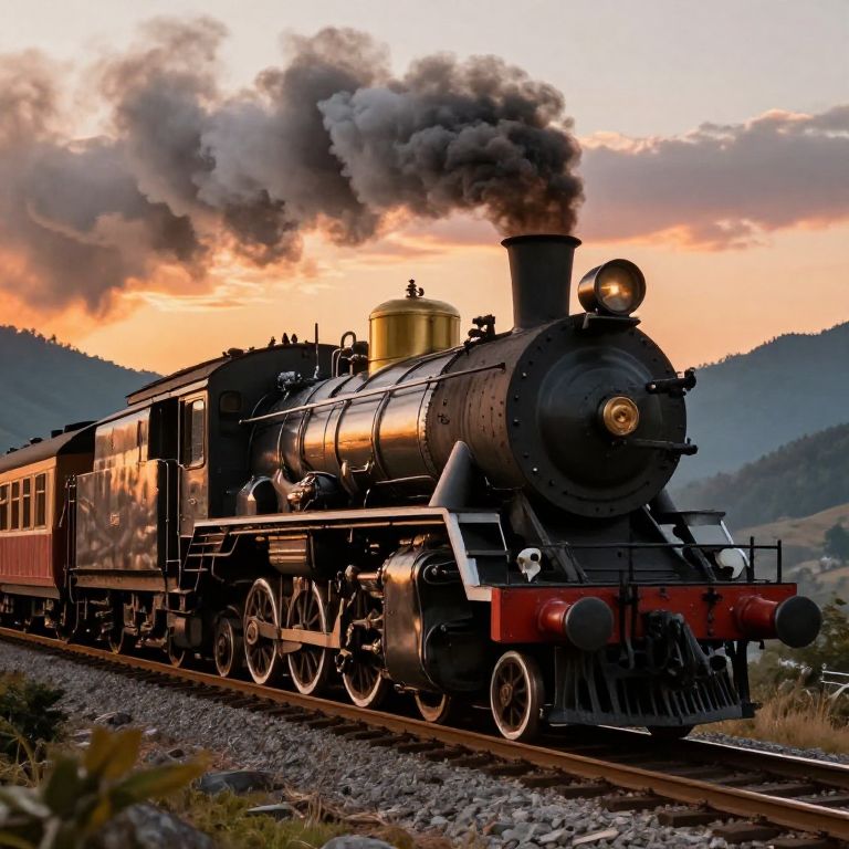 400lb vintage steam locomotive chugging along a scenic mountain railway, billowing thick smoke against a dramatic sunset sky, detailed mechanical parts and rich textures on the train, concept art style with warm tones and dynamic perspective.