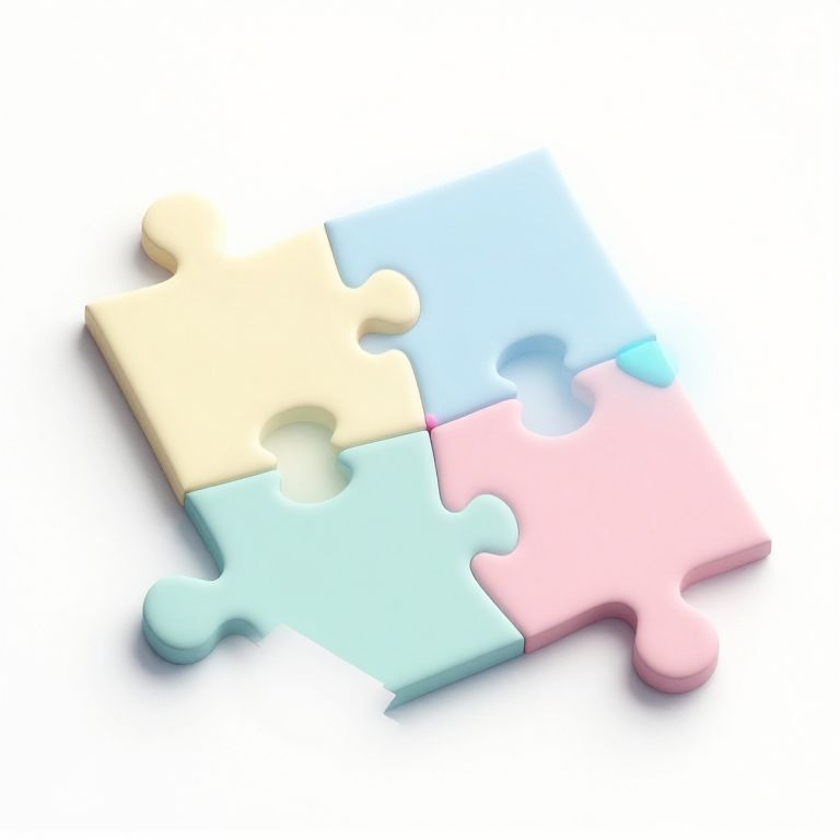 Photograph of four interlocking jigsaw puzzle pieces: yellow, blue, pink, and light blue, arranged diagonally on a white background.