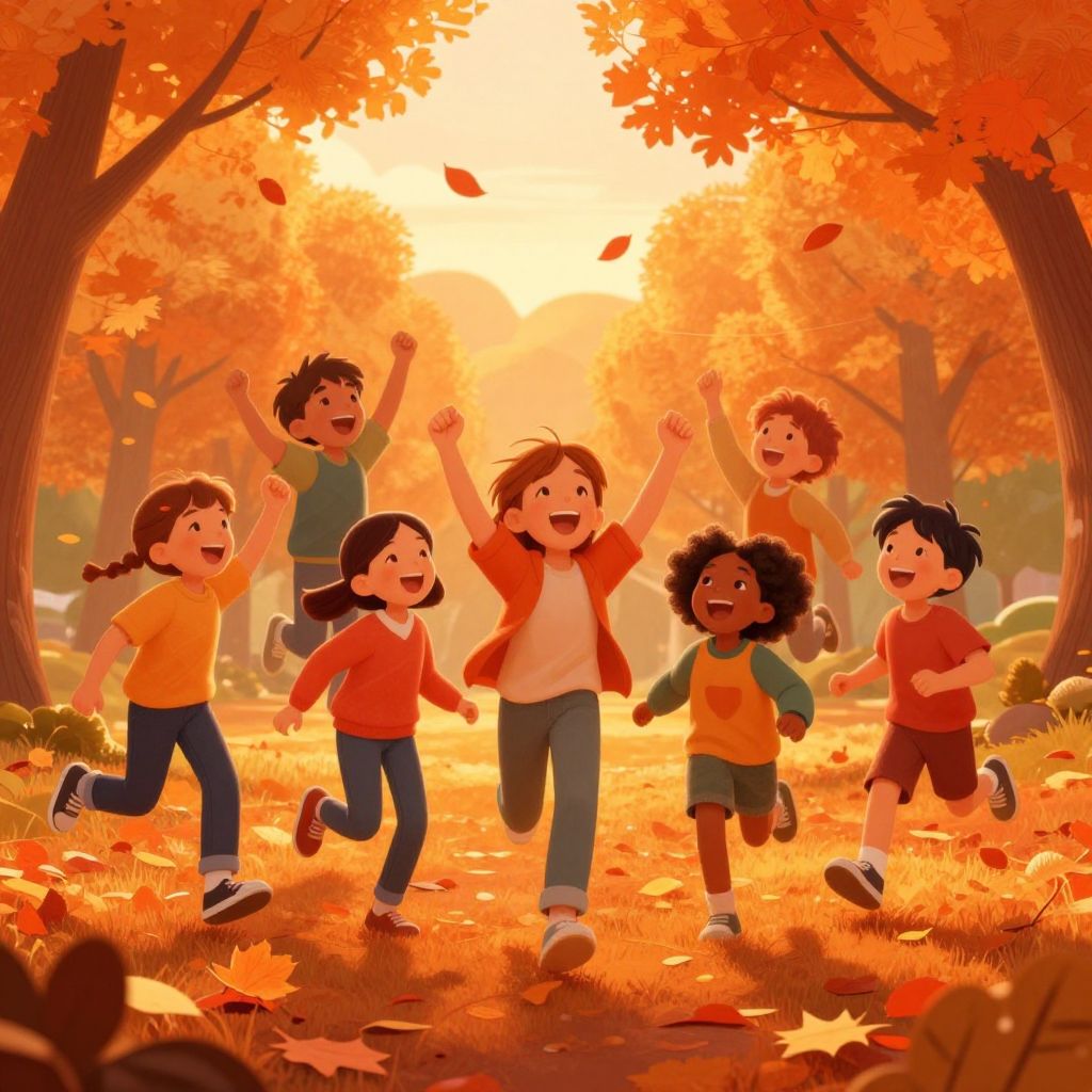 Exuberance illustrated by a group of children playing in a park, faces lit with laughter, dynamic poses of jumping and running, swirling autumn leaves in rich oranges and reds, a warm golden hour glow enhancing the cheerful atmosphere