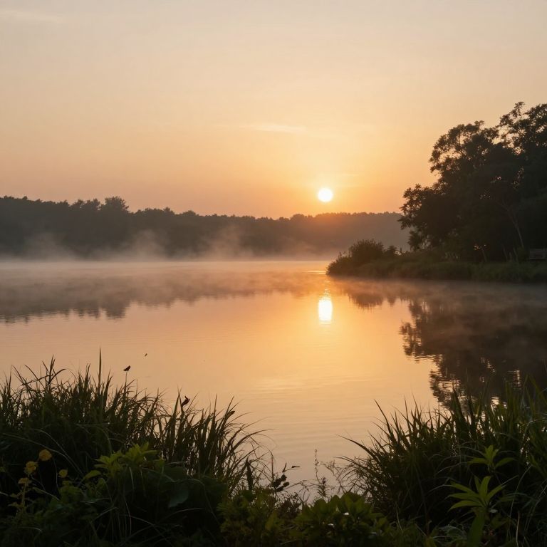 Photograph of a serene river at dusk, reflecting a vibrant pink and purple sunset sky, flanked by dark silhouetted trees.