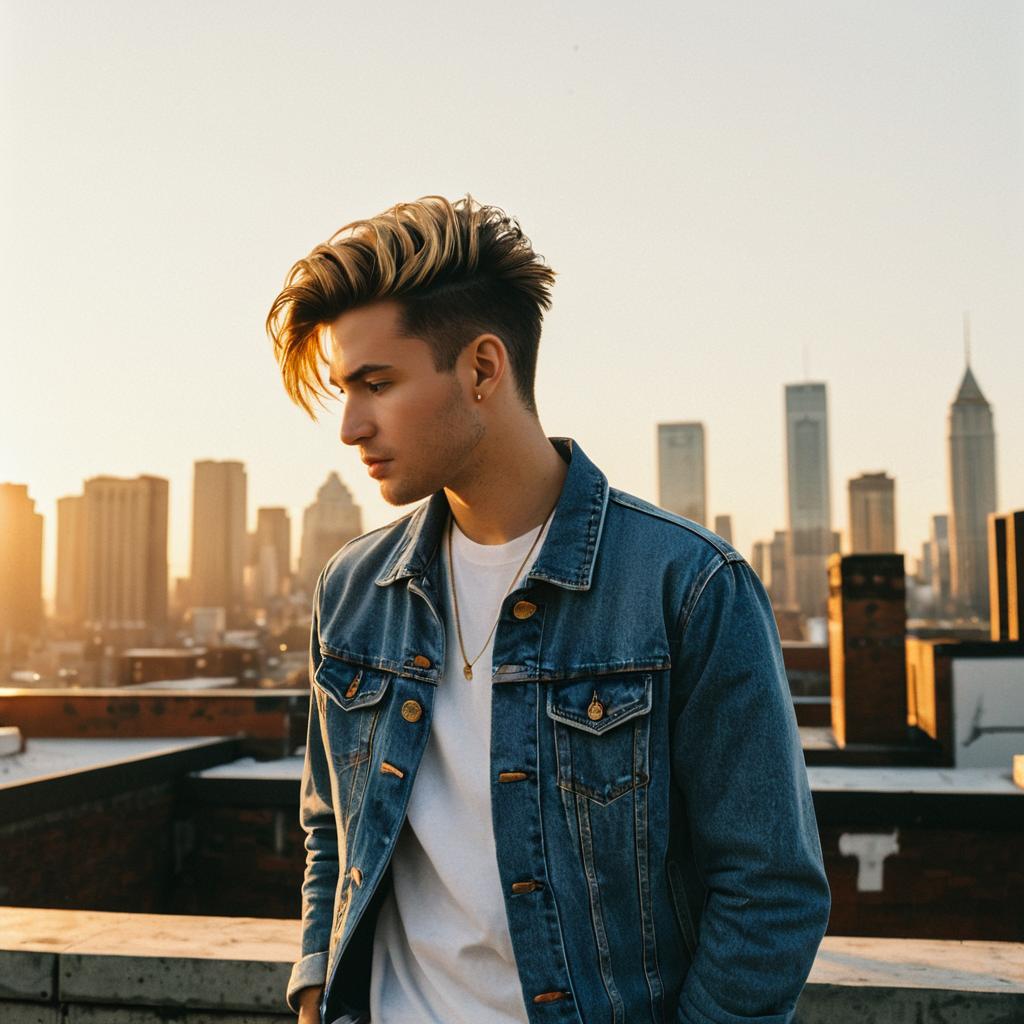 Young Caucasian male model with a stylish temple fade hairstyle, wearing a denim jacket and white t-shirt, posing on a rooftop during golden hour. The city skyline in the background suggests an urban setting with warm natural light enhancing the scene, captured in a fashion editorial style.