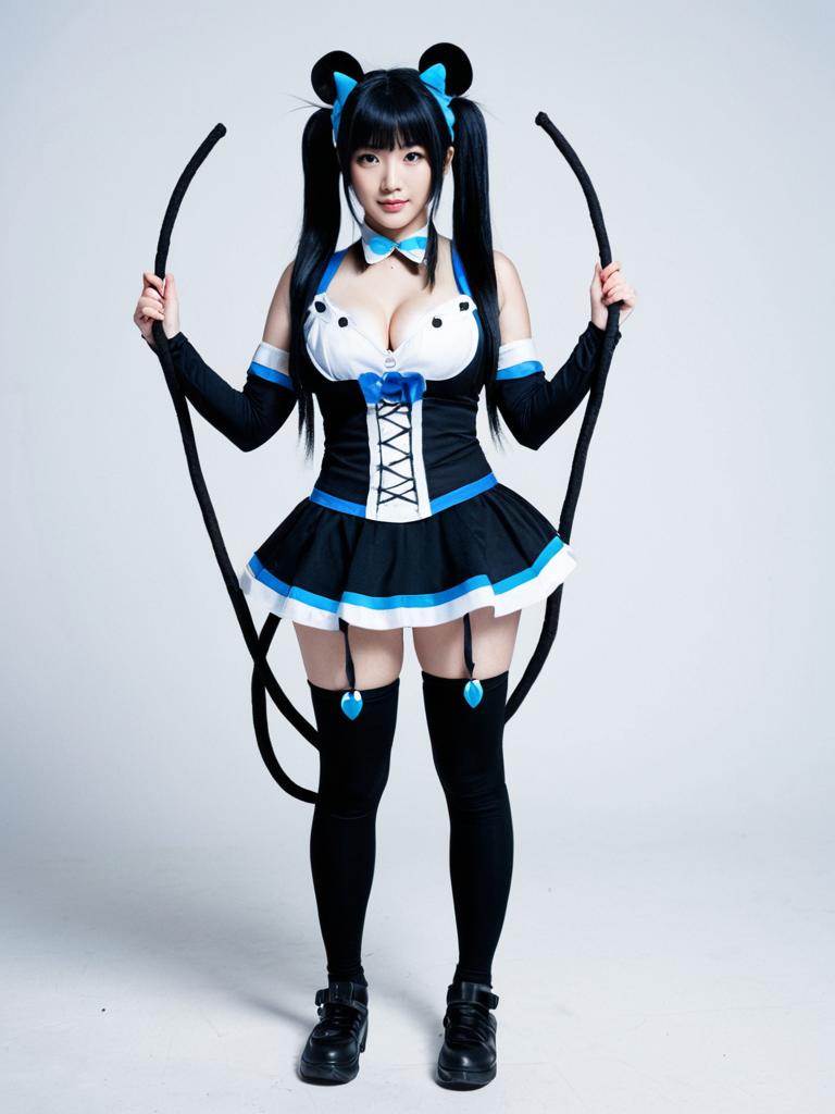 Photo-realistic cosplay photo of person in hamuzou costume. Full body. Standing. Full length. 1girl, fang, blue eyes, black hair, long hair, antenna hair, ponytail, hair ribbon, medium breasts, hamster, animal