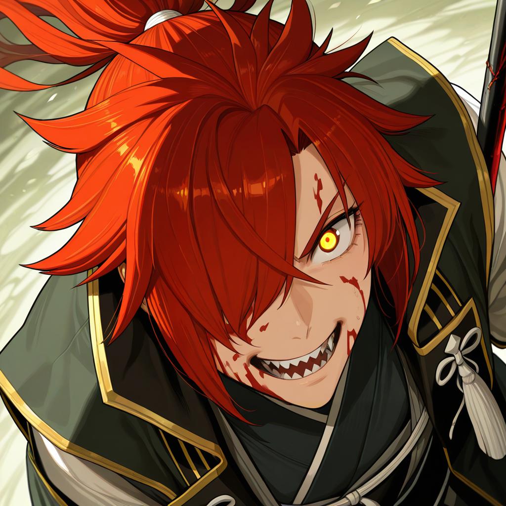 Mori nagayoshi (fate), fate (series), 1boy, sharp teeth, yellow eyes, hair over one eye, red hair, long hair, spiked hair, ponytail, blood on face, japanese clothes, japanese clothes, spear, jinbaori, by artist blue borscht, illustrious