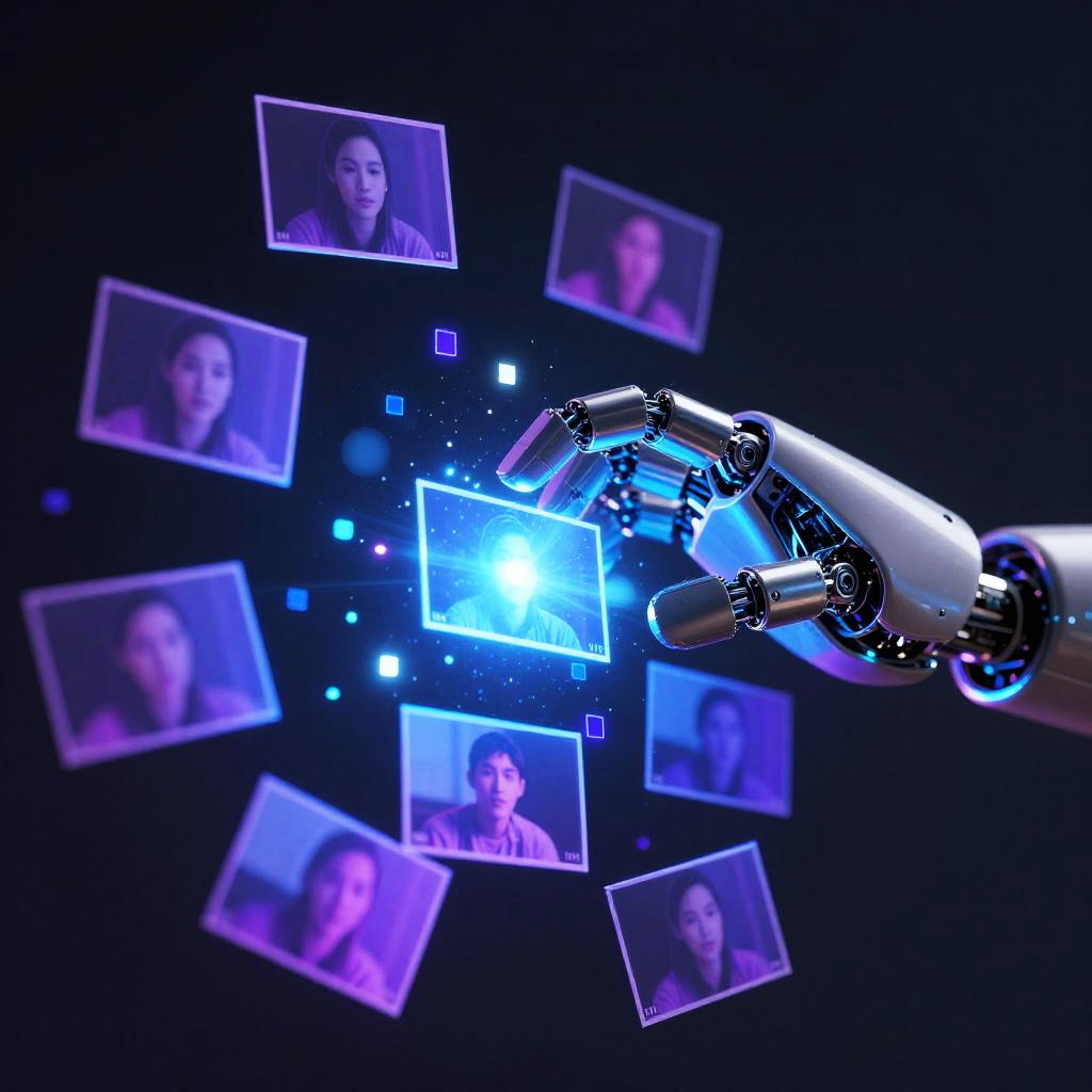 A cinematic scene showcasing video inpainting algorithms at work, with fragmented video frames being magically reconstructed in mid-air by a robotic hand surrounded by floating pixels, set against a dark background illuminated by vibrant, electric blue and purple hues.