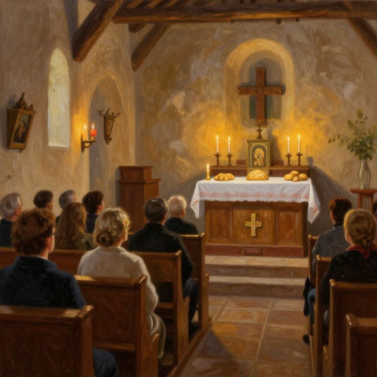 Eucharist moment captured in a rustic village church, warm candlelight flickering, wooden pews filled with diverse worshippers, altar decorated with traditional cloth and fresh bread, calm and intimate ambiance, oil painting style with textured brushwork and warm color scheme.
