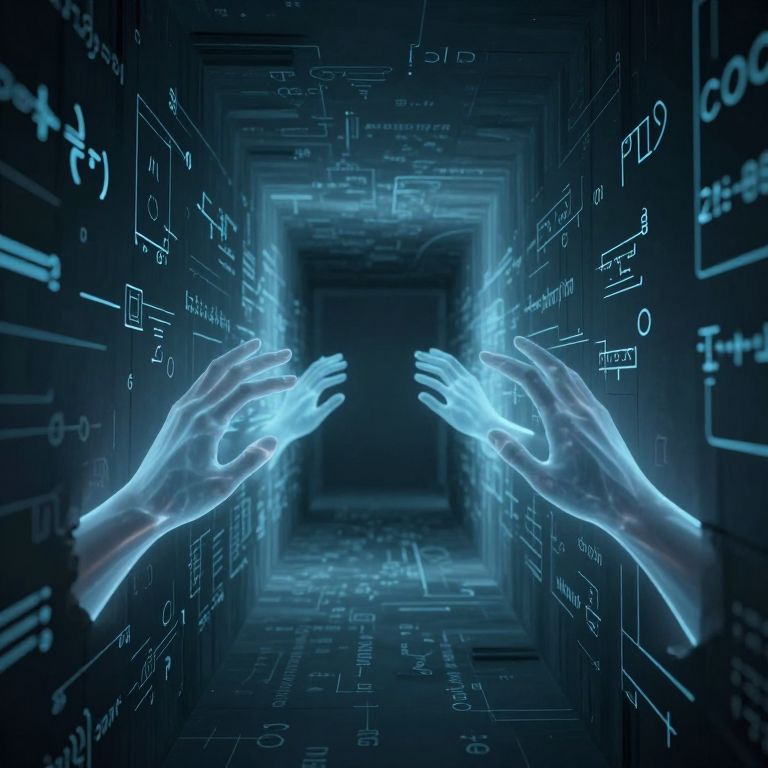 In a cyberpunk-inspired 3D render, translucent, ghostly hands emerge from the walls of a dimly lit corridor, their ethereal glow casting a luminescent path toward an unseen destination, evoking a sense of otherworldly guidance through a digital landscape of abstract equations and futuristic aesthetics.