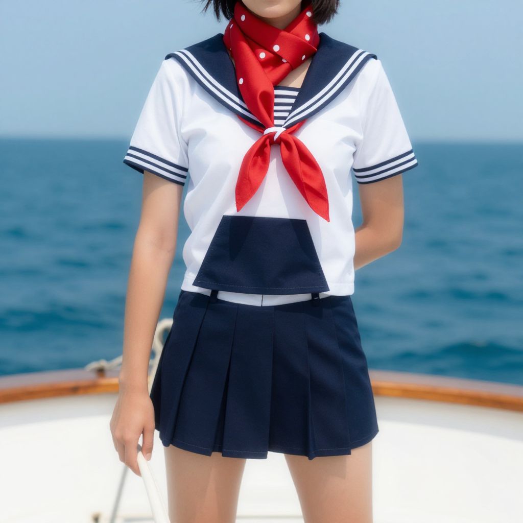 Photograph of an Asian girl in a white sailor uniform with red scarf, black pleated skirt, standing on a boat by the ocean.