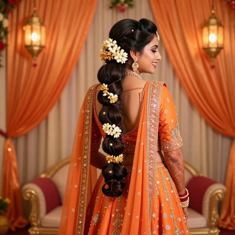 A joyful bride in a royal orange wedding lehenga with flowing fabric and a bold, voluminous hairstyle consisting of a high ponytail with a cluster of golden jasmine flowers woven into the hair, standing in a festive wedding setup with silk drapes and traditional Indian lanterns in the background