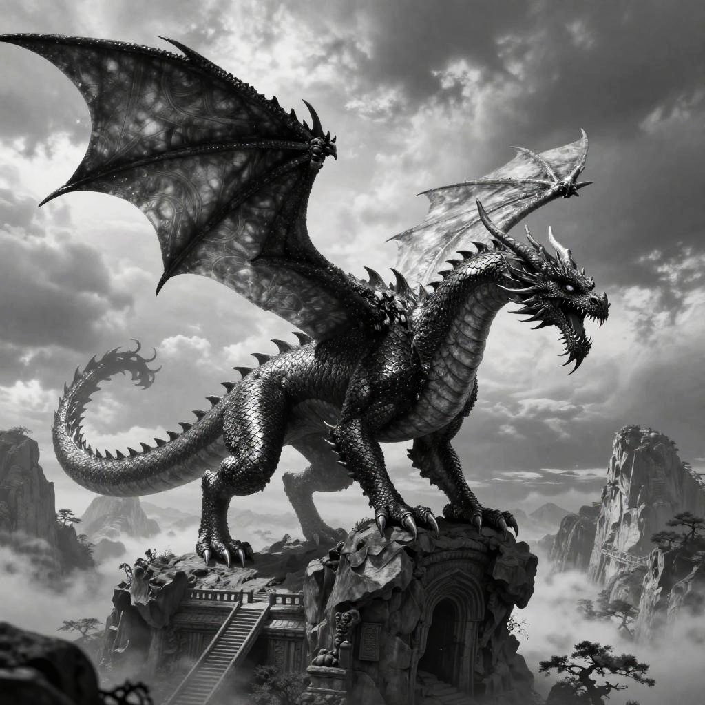 Fantasy black and white dragon soaring above ancient mountains under a stormy sky, intricate scales shimmering with monochrome contrast, majestic and fierce, highly detailed illustration