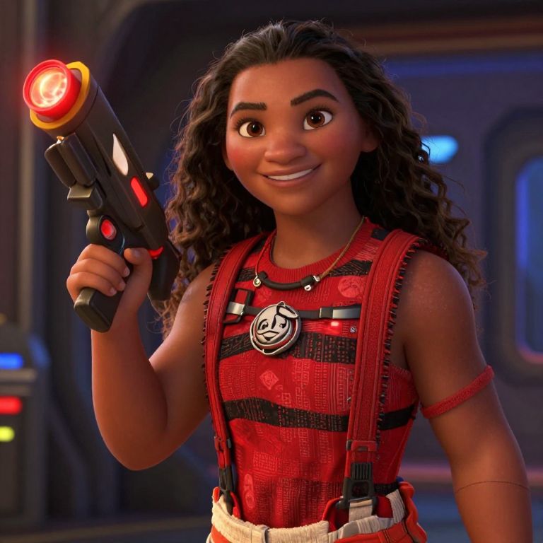 A digitally rendered CGI image of a young woman with curly dark brown hair and medium brown skin, smiling confidently. She wears a red and black striped sleeveless top with a black and white circular emblem on the chest, and red suspenders. She holds a black futuristic gun with a glowing red light on top in her right hand. The background is a dimly lit, sci-fi setting with blue and red lights. The image has a vibrant, animated style, similar to Disney or Pixar characters.