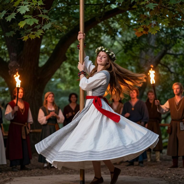 In this enchanting medieval scene, a young maiden dances gracefully around a maypole, her long, flowing hair cascading down her back as she spins. She is adorned with a delicate flower crown, adding a touch of nature's beauty to her attire. Her dress, a blend of white and gray, is accented with intricate patterns and a vibrant red sash, creating a striking contrast against the lush greenery of the surrounding trees. The maiden's hands grip the maypole, her fingers adorned with colorful bracelets, while her face is illuminated by the soft, warm light filtering through the foliage. In the background, a group of people, some holding torches, watch the maiden's dance, their faces illuminated by the flickering flames. The entire scene is bathed in a perfect, photo-realistic light, highlighting the textures of the maiden's dress, the intricate patterns on her jewelry, and the lush green leaves of the trees. The composition is dynamic, with the maypole serving as the central axis around which the maiden and her audience revolve, creating a sense of movement and energy.