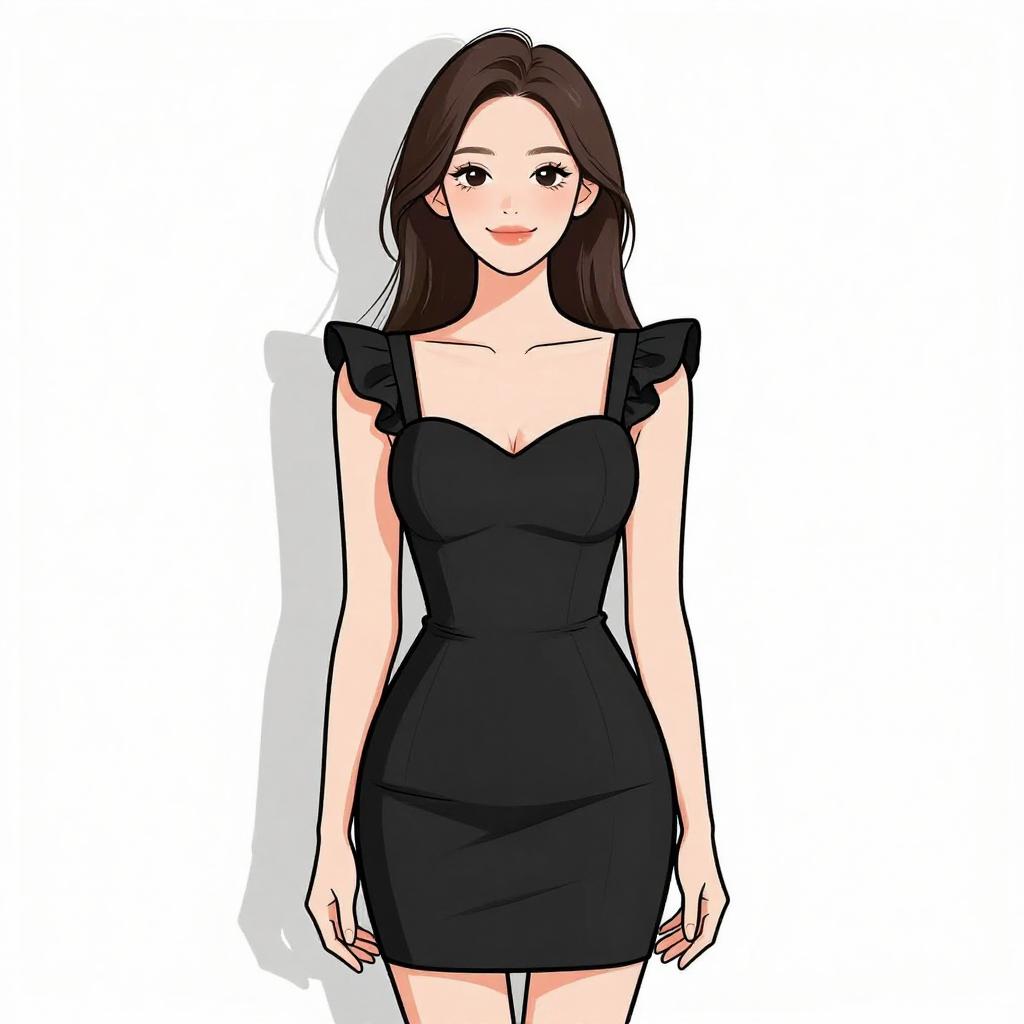 Digital anime-style drawing of a smiling young woman with long dark brown hair, wearing a black and white striped short dress.