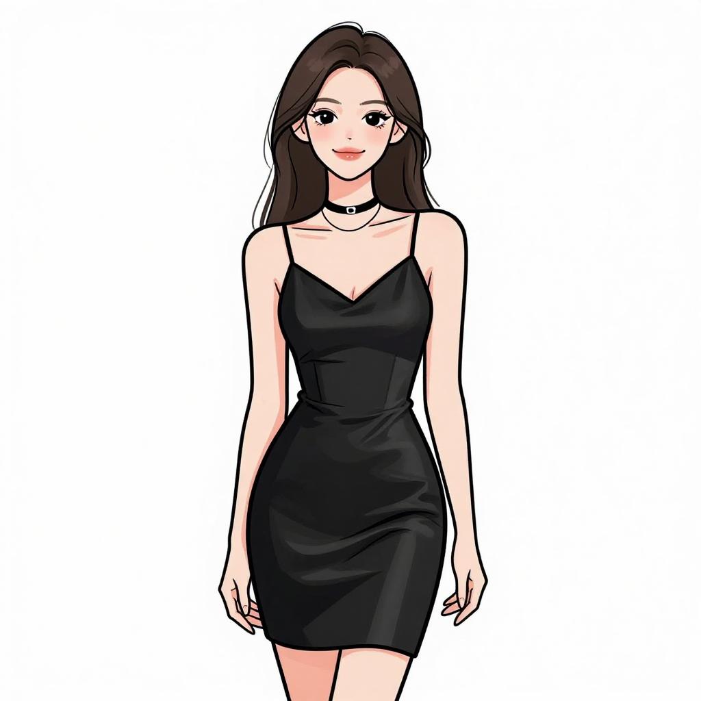This is a digital anime-style drawing of a young woman with long, wavy brown hair and fair skin. She has large, expressive brown eyes and a slight smile. She is wearing a black and white striped, short-sleeved, fitted dress that hugs her slender figure, and a black choker necklace. The background is plain white, making her the focal point. The artist uses bold, clean lines and bright colors typical of anime artwork, giving the image a vibrant and modern look.